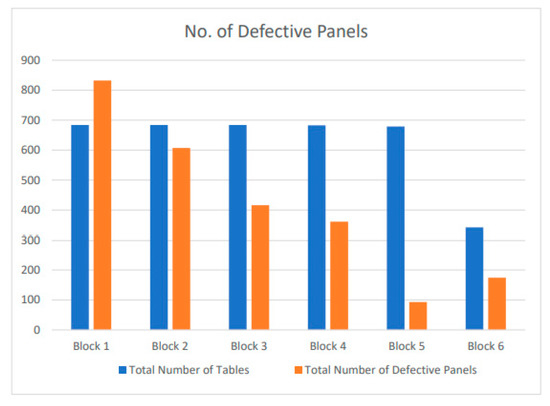 No. of defective panels. The statistical graphic analysis of the number of panels in its block versus the number of defective panels in the corresponding block.