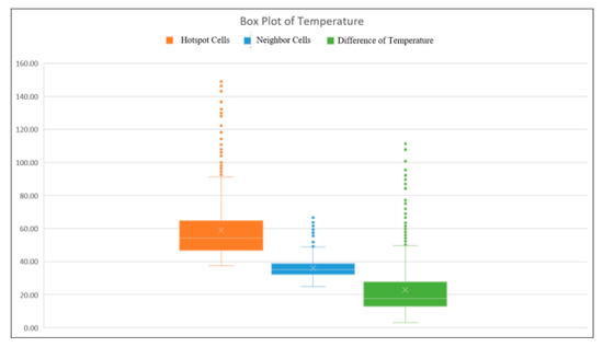 The boxplot of the temperature of hotspots, their neighboring cells, and differences between both. The bottom line of its box represents the first quartile, the medium line represents the second, and the top line the third. The outliers appear outside the maximum of its box.