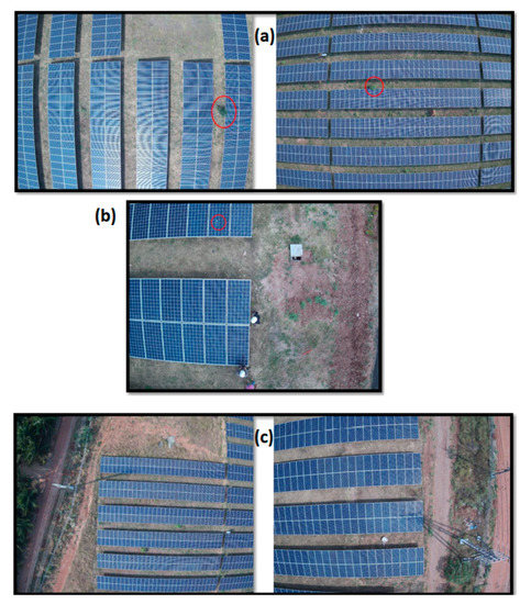 Some of the reasons detected for defective panels are related to external factors, such as the growing of plants (a), bird droppings (b), and shadows (c).