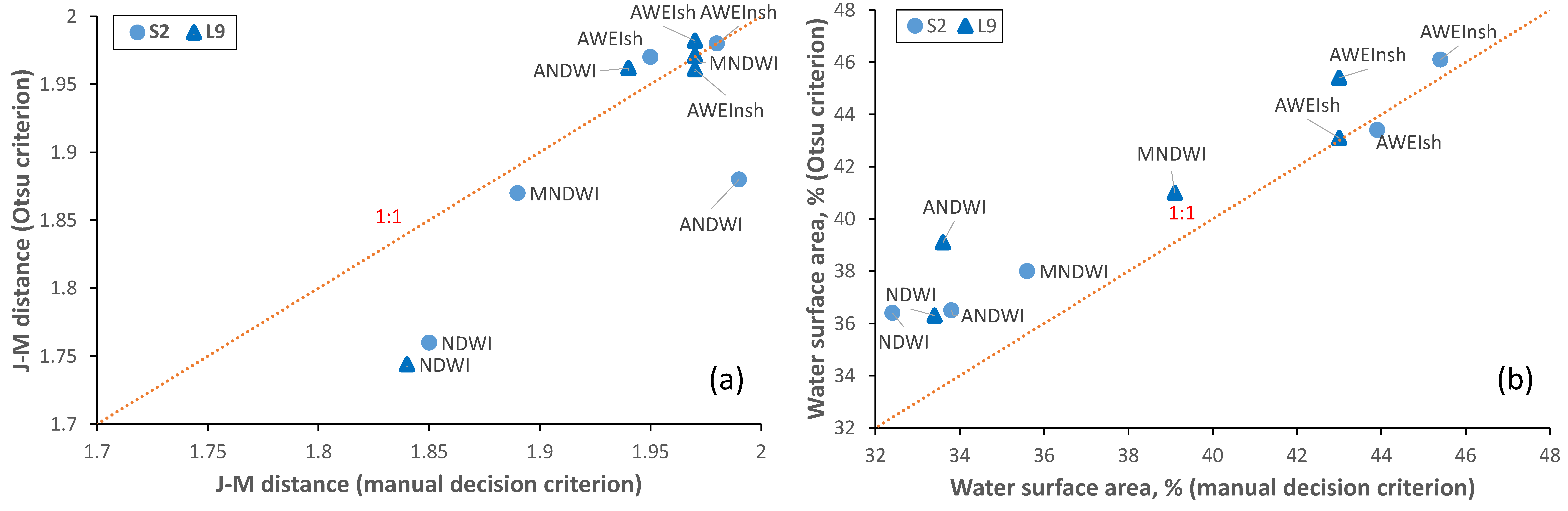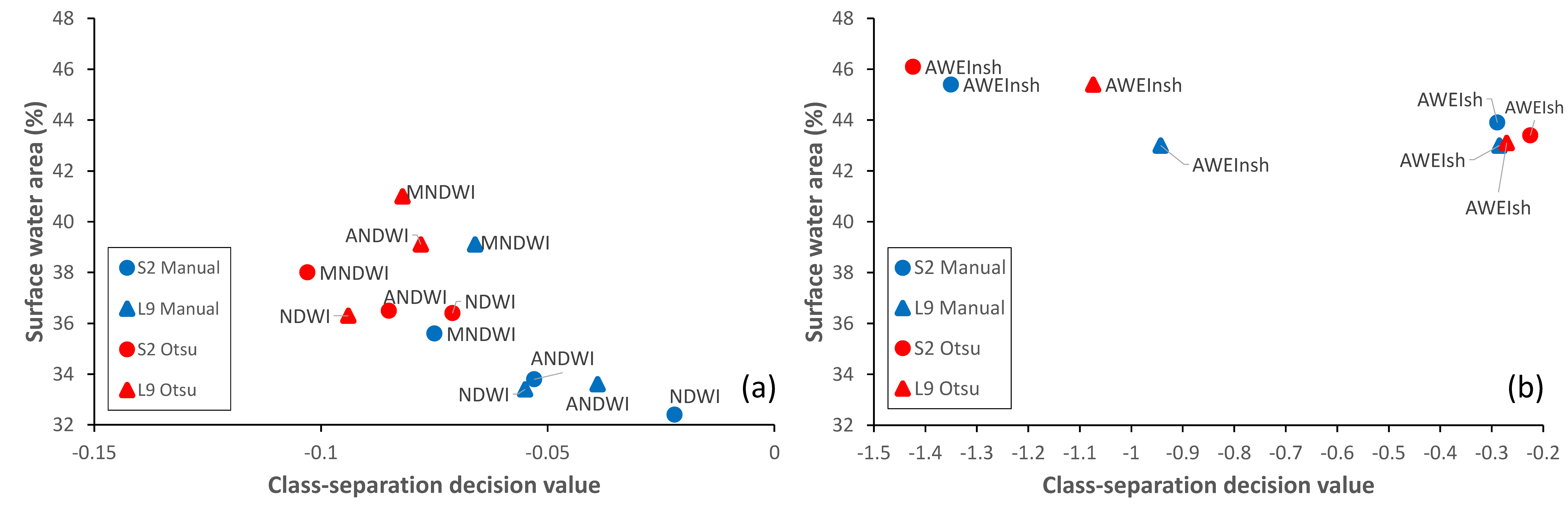 | Satellite | Water Indices | Pixel Value Mean | Class Separation Value from Manual Decision | Water Class Area (%) | Non-Water Class Area (%) | J–M Distance |