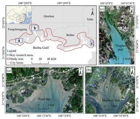 Geographical location of the study area. (a) Pearl Bay Mangrove Reserve. (b) Maowei Sea Mangrove Reserve. (c) Shankou Mangrove Reserve.