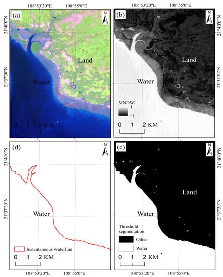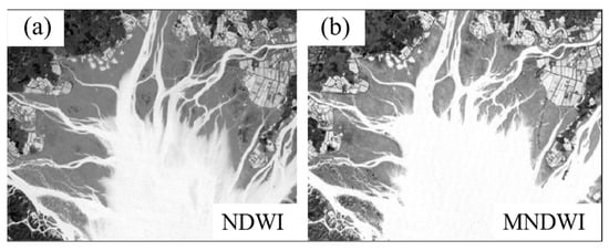 Traditional methods were applied to remotely sensed images with bands of 0.4−2.5 μm to identify the water bodies, but it is difficult to identify the water-edge line accurately due to the influence of water depth, suspended matter, and impurities [,]. This study proposes a combination of multiband differences or ratios [], including the normalized difference water index (NDWI) and modified normalized difference water index (MNDWI) [,].