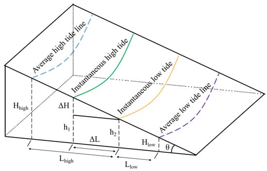 Where Hhigh is the annual mean high-water spring tide; Hlow is the annual mean low-water neap tide; h1 is the instantaneous tide height at the moment of high-tide image acquisition; h2 is the instantaneous tide height at the moment of low-tide image acquisition; ΔH is the tidal-level difference at the time of high-tide and low-tide image acquisition; ΔL is the distance between the instantaneous high-tide water edge and the instantaneous low-tide water edge; θ is the slope of tidal flats; Lhigh and Llow are the correction distances for the tide level. Different parameters were calculated using the following equations:
