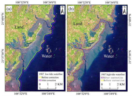 where h is the instantaneous tide height at the time of image acquisition, hleft is the instantaneous tide height at one full point before the image acquisition time, hright is the instantaneous tide height at one full point after the image acquisition time, Th is the time of image acquisition, Tleft is the time before the image acquisition time, and Tright is the time after the image acquisition time. Tleft and Tright could be extrapolated from Th, the corresponding hleft and hright could be queried, and then Equation (7) could be interpolated to calculate h1 and h2. Substituting h1 and h2 in Equations (3)–(6), the correction distance was obtained using Lhigh and Llow. Based on the tidal correction distances Lhigh and Llow, a tidal correction was applied to the extracted instantaneous water-edge line, where positive values indicated seaward extension and negative values indicated shoreward movement. Figure 5 shows a comparison before and after correction of the local water-edge line. In 1987, the low-tide water-edge line extended 146 m into the sea, whereas the high-tide water-edge line extended 68 m into the sea. The range of tidal flats can be obtained using a superposition analysis of high-tide and low-tide water-edge lines after the completion of tidal-level correction.
