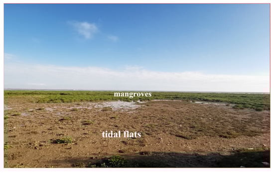 Mangrove forests can reduce the velocity of seawater, facilitate sediment deposition, and accelerate the development of tidal flats (Figure 6) [,,,]. To quantitatively investigate the role that spatio-temporal changes in mangroves play in the spatio-temporal changes in tidal flats, this study used an object-oriented multiscale segmentation method based on eCognition 10.2 software to remotely identify and extract the main mangrove distributions in the study area [,]. In this study, the segmentation scale was determined to be 200, and the shape factor and compactness were set as 0.2 and 0.5, respectively. Image elements of remote sensing images were no longer the smallest unit of classification after multiscale segmentation, and image objects replaced the spectral, shape, texture, and spatial relationship features among the image objects.