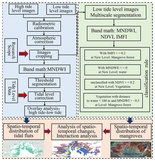 It is extremely difficult to conduct a large-area ground survey and monitor tidal flats, as it not only requires considerable human and material resources but also a harsh observation environment []. The lack of periodic tidal flat data greatly restricts spatio-temporal dynamic monitoring and analyses of changes in tidal flats. With the rapid development of remote sensing technology, the number of high-quality remote sensing satellites is increasing, along with spatial, temporal, and spectral resolutions of remote sensing images [,,,]. This has gradually become the preferred method for large-scale observation and the spatio-temporal distribution study of tidal flats []. The primary methods related to the application of remote sensing technology to extract the distribution of tidal flats in recent years include the waterline method based on the tidal correction model for tidal flats’ extraction [,,]. The waterline method is widely used to extract tidal flats by acquiring a waterline during satellite transit and combining it with the tidal correction data. Murray et al. [] used a regional tidal model and Landsat satellite data to obtain information on changes in the Yellow Sea coastal wetlands in China, and Han et al. [] used a tidal correction model to monitor changes in Chinese tidal flats between 1995 and 2015. However, the differences in the environments of different regions, complexity of coastal zone topography, and influence of tidal changes considerably affect the accuracy and precision of extraction. A machine learning algorithm was used for sample training to classify and extract tidal flats. Machine learning algorithms, such as random forests and support vector machines with training samples, have also been widely applied to tidal flats’ classification []. Zhang et al. [] used machine learning algorithms to extract tidal flats’ information from the coastal zone, from Hangzhou Bay to the Yalu River in eastern China, and Wang et al. [,] used a decision tree algorithm based on expert knowledge to extract the range of tidal flats and coastal wetlands in China. However, these algorithms require considerable time and energy to train samples and are prone to misclassification. For example, a wide range of ponds and inland mudflats are often misclassified as tidal flats []. A threshold segmentation method was used to extract instantaneous waterlines and tidal flats. Wang et al. [] proposed the same tide-level comparison method based on extracting the instantaneous waterline in a single time phase, and selected the most suitable remote sensing images coinciding with the lowest and highest tide time of the high tide to track and analyze the evolution pattern of tidal flats in the Caofeidian area for the last 30 years. Jia et al. [] proposed the MSIC-OA method [] based on a large number of Sentinel-2 images from a long time series, comparing multiple spectral indices for different land classes and using the spectral index composite method and Otsu algorithm to automatically map the intertidal zone of China. Aedla et al. [] combined histogram clipping equalization contrast-enhancement technology with automatic threshold averaging to propose an automatic coastline monitoring method. The coastline of the estuarine region on the west coast of India was extracted using pixel adjustments to smoothen the morphological image of the coastline. However, these methods heavily depend on the hydrological conditions at the time of acquiring remote sensing images, thus the results of tidal flats’ extraction are contingent to a certain extent. In summary, these methods are influenced by tide-level data, sample training results, remote sensing image acquisition time, and other auxiliary data when extracting tidal shoal information over a large area. However, it is difficult to obtain high-precision tidal shoal distribution results because of drastic environmental changes and the interconversion of various feature coverage types. In addition, densely distributed tidal flats are usually accompanied by the large distribution of salt-tolerant vegetation (such as mangrove and Spartina alterniflora) [,,]. However, there has been scarce research on the interaction between mangrove vegetation clusters and the spatio-temporal distribution of tidal flats.