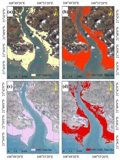 Comparison of tidal flats extractions with UQD data in Beihai Coast. (a) The 1987 tidal flats extracted by the method in this paper. (b) The 1987 tidal flats of UQD. (c) The 1995 tidal flats extracted by the method in this paper. (d) The 1995 tidal flats of UQD.