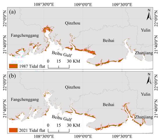 Distribution of tidal flats in Beibu Gulf in 1987 and 2021. (a) Distribution of tidal flats in Beibu Gulf in 1987. (b) Distribution of tidal flats in Beibu Gulf in 2021.