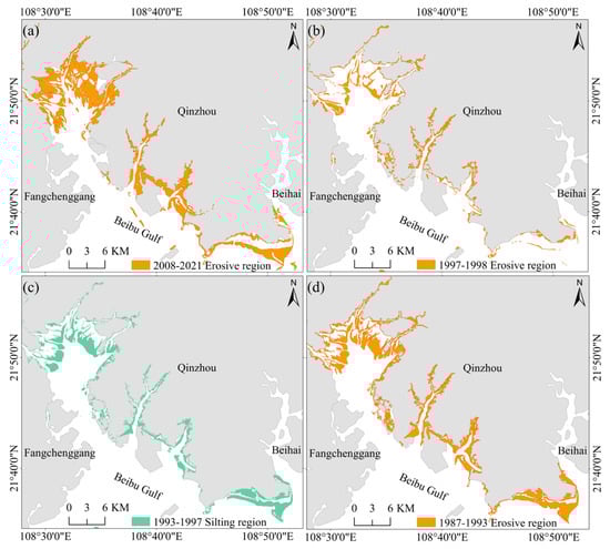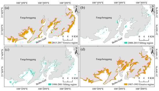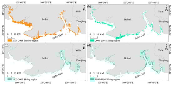 Distribution of spatio-temporal siltation and erosion of tidal flats in the Beihai shore section. (a) Erosion distribution of tidal flats in Beihai shore section from 2008 to 2018. (b) Siltation distribution of tidal flats in Beihai shore section from 2006 to 2008. (c) Siltation distribution of tidal flats in Beihai shore section from 2003 to 2005. (d) Siltation distribution of tidal flats in Beihai shore section from 1990 to 1994.