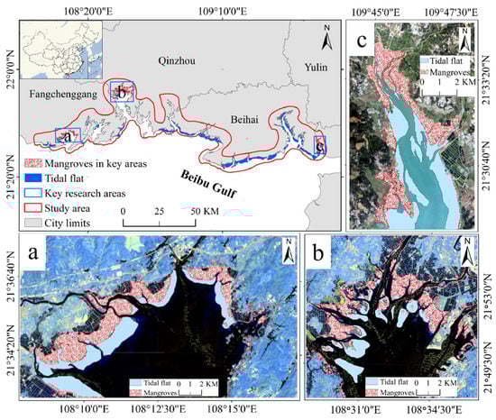 Latest (2021) tidal flats and mangrove distribution in the study area. (a) Pearl Bay tidal flats and mangrove distribution. (b) Maowei Sea Mangrove Reserve tidal flats and mangrove distribution. (c) Shankou Mangrove Reserve tidal flats and mangrove distribution.