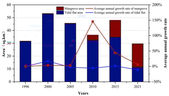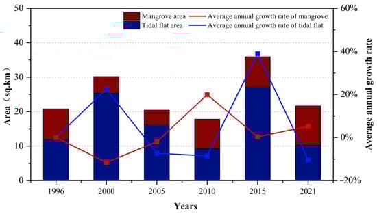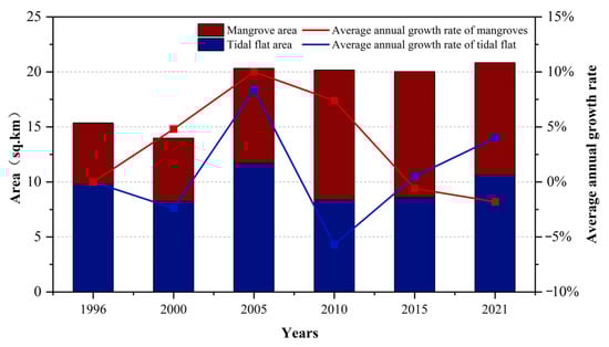 The distribution of tidal flats and mangroves in the study area in 2021 is shown in Figure 16. The mangrove stock in the three mangrove concentration areas showed an increasing trend, except for the years 1996−2000, when the total stock was negative. The remaining years showed a positive growth, with a maximum annual average growth rate of 16.6% in 2010. However, the total tidal flats in the three mangrove areas showed a decreasing trend, with a maximum negative annual growth rate of −9.1% in 2021 and a total decrease of 21 km2 in tidal flats over the 25-year period.