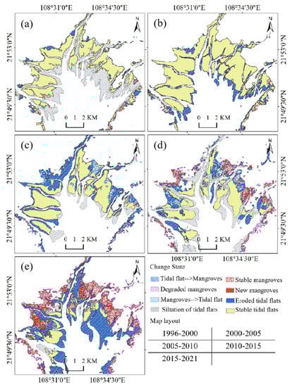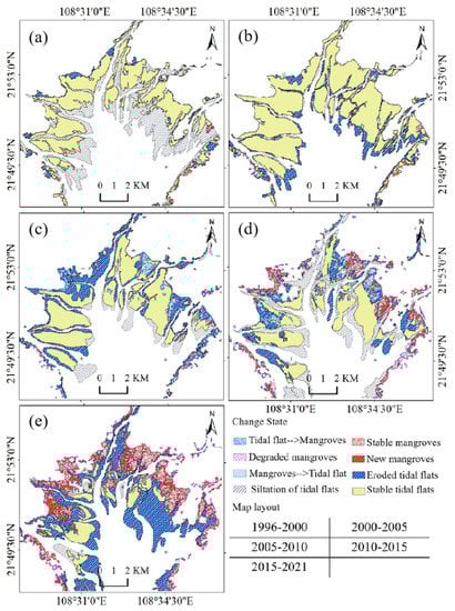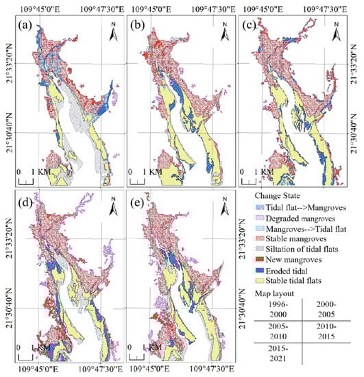 Tidal sequence change and centroid transfer of mangrove tidal flat in Shankou area. (a) Interclass changes of mangroves and tidal flats in Shankou area from 1996 to 2000. (b) Interclass changes of mangroves and tidal flats in Shankou area from 2000 to 2005. (c) Interclass changes of mangroves and tidal flats in Shankou area from 2005 to 2010. (d) Interclass changes of mangroves and tidal flats in Shankou area from 2010 to 2015. (e) Interclass changes of mangroves and tidal flats in Shankou area from 2015 to 2021.