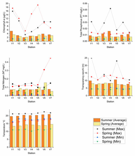 The characteristics of the limnological parameters shown in Figure 1 are evidence of the trophic state of Lake Villarrica. It is classified as an oligotrophic lake in transition to a higher trophic state (mesotrophic). The average transparency behavior fluctuates between 6.46 m in spring and 9.69 m in summer, while the nutrients’ total nitrogen and total phosphorus are inversely proportional to Chl-a values, as can be observed in Figure 1. As for temperature, it is known that this physical parameter regulates many processes in aquatic systems and algal productivity [64,65]. Temperature values range from 22 °C in summer to 11 °C in spring. The blooms in the lake manifest themselves when the temperature exceeds 18 °C.