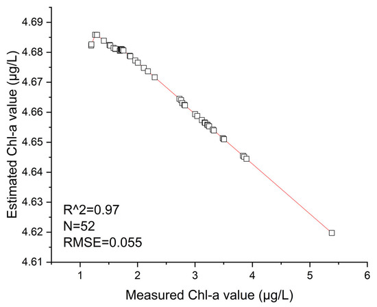 Pearson’s correlation coefficient (r) was used to analyze the correlation between the Chlorophyll-a variable and the nine selected spectral indices. The different values obtained for the selected indices are shown in Table 5, and it can be observed that, of the nine indices calculated, three resulted in a high r (FAI, SABI, and GCI). This shows that the selected algorithms have a high degree of correlation. Meanwhile, indices such as EVSI and NDTI presented low values of Pearson’s correlation coefficient; therefore, these spectral indices do not have a sufficient degree of correlation to estimate Chl-a in the lake. Several multiple linear regressions were performed combining the indices that presented the best correlation. The Chlorophyll-a recovery model between the FAI and SABI indices obtained statistical values of a MBE of −0.136 μ, RMSE of 0.055 μ, and NRMSE of 0.019%. On the other hand, the statistical results obtained from the combinations between the GCI with SABI and GCI with FAI indexes obtained MBE values of −0.56 μ and −0.50 μ, RMSE values of 0.057 μ and 0.055 μ, and NRMSE values of 0.030% and 0.023%, respectively. Therefore, the statistical results obtained demonstrate that the combination between FAI and SABI indices generates a multiparametric linear regression model that estimates Chl-a concentration in this lake more accurately. The resulting multiparametric regression model was obtained using the linear equation Chl-a = −6.26 × SABI − 10.34 × FAI + 4.72 (adjusted R2 = 0.97). As can be seen, the adjusted coefficient of determination of the Chl-a estimation model was high. The model was validated by comparing samples of N = 52 with measured and estimated Chl-a concentrations (μ). For validation of the proposed Chl-a estimation model, 30% of the total data was used. Figure 2 shows the graphical comparison between the estimated and measured values, which present a high fit, represented by the red line. The results of the model show its robustness, but the amount of data used during the model validation stage remains a limitation due to the lack of real data.