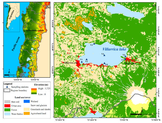(a) Chile in South America; (b) Araucanía Region with topographic profiles, with the study area, including Lake Villarrica, outlined in black; and (c) the land uses of the Villarrica basin.