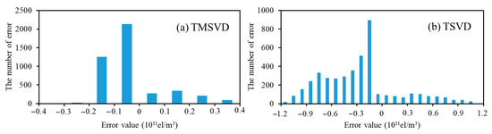 The reconstructed error between the inversion results of the two algorithms and the simulated true values is computed. Figure 2 shows the error statistical diagram of the two algorithms. Figure 2a illustrates that the maximum error absolute value is 3.87 × 1010 el/m3, and the error absolute values of about 85% voxels are less than 2 × 1010 el/m3. Figure 2b shows that the maximum error absolute value of the error is 1.16 × 1011 el/m3, and the error absolute values of only 27% voxels are less than 2 × 1010 el/m3. The error statistics validate the accuracy of TMSVD as being higher than that of the TSVD. According to Equations (16) and (17), the MAE and RMSE of two algorithms is obtained. The MAE of TMSVD is 1.01 × 1010 el/m3, and the RMSE is 1.54 × 108 el/m3. However, the MAE of TSVD is 4.45 × 1010 el/m3, and the RMSE of TSVD is 6.8 × 108 el/m3. The above facts validate that the TMSVD is superior to the common TSVD in performing the tomographic reconstruction of IED distributions.