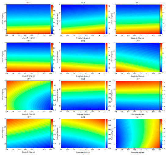 Figure 6 reflects the diurnal variations of the ionosphere at the cross section of 350 km on 25 August 2018. According to the longitudinal distribution of the IED over the Hunan province, an apparent difference is shown. The IED values in the east is greater than those in the west during 01:00 UT–05:00 UT, and then the IED values in the west are greater than those in the east. However, during 21:00 UT–23:00 UT, the longitudinal distributions of the IED return to the state of the time periods of 01:00 UT–05:00 UT. In the latitudinal direction, the IED values in the north are greater than those in the south between 13:00 UT and 21:00 UT. Nevertheless, the IED values in the low-latitude region are greater than those in the high-latitude region in other time periods. As time goes on, the IED values gradually increase, and the IED value reaches its maximum at 07:00 UT. Subsequently, the electron density distributions start to decrease; the minimum IED value occurs at 21:00 UT (5:00 local time). The diurnal variations rules are identical to the Earth’s rotation phenomenon. This also coincides with the alternation of day and night.