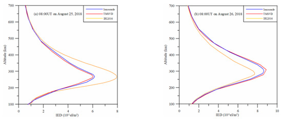 The three-dimensional IED distributions reconstructed using TMSVD and the IRI 2016 model at 8:00 on 25–26 August 2018.