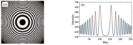 The interference pattern is first formed by the etalon, and then a 2D interferogram is made on the CCD camera; it is difficult to directly invert the wind speed and temperature. Therefore, we apply an annular summation to convert the 2D image into 1D [17,26]. Annular summation is used to divide the interferogram into a predetermined number of rings (bins in the 1D interferogram), the center of which is the interferogram center derived above. The mean value of the pixels in each ring is calculated and the mean values of these rings form the 1D interferogram. The 1D interferogram is a function of radius and can be described using Equation (11).