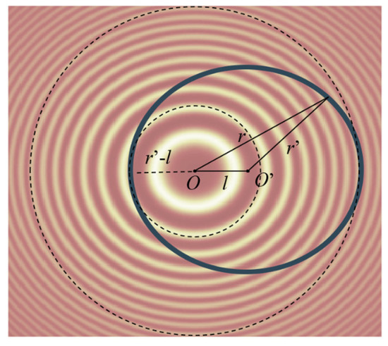 As shown in Figure 4, is chosen as the center for performing the annular summation, is the real interferogram center, and is the distance between the two centers. The center of the two dotted circles is . The black annulus is one of the segmented ones. According to the calculus idea, we consider this annulus as a circle . The average value of the pixel intensity in this region is: