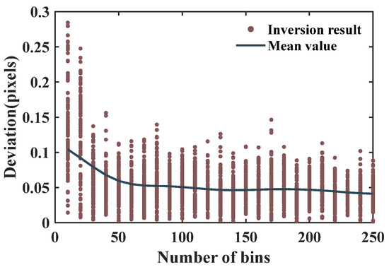 The number of bins affects the accuracy of the MSDM in determining the center. Two hundred images identical to Figure 1 are generated, except for the location of the center. The results of the experiment are shown in Figure 5. When the number of bins is small, the error is large. If the number of bins is more than 100, the mean value is less than 0.05 pixels, which is higher than the accuracy required to invert the wind speed and temperature.