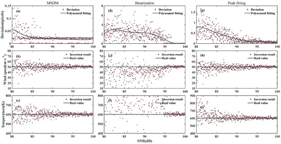 Gaussian white noise in interferograms is an essential influence on ground-based FPI observation, which is caused by the atmosphere and background light, etc. Figure 6 shows the centers determined by the MSDM, binarization, and peak fitting, respectively, as well as the wind and temperature inverted with them. The error of the center derived with the MSDM is small, less than 0.05 pixels. Both wind and temperature distributions are symmetric to the real value and approach the real value as the signal-to-noise ratio (SNR) increases. This distribution differs from the distribution of results due to central error, as shown in Figure 3. When the SNR is less than 97 dB, the deviation of binarization is too large to invert the result. The wind is less than the real value and the temperature is greater than the real value, all of which can be explained by Figure 3. The error of the peak fitting is less than 0.8, which is better than the binarization. Therefore, binarization has the worst performance. The MSDM and peak fitting are similar in wind speed, while the temperature distribution of the MSDM at low SNR is 500~750 K, which is less than the 500~900 K of the peak fitting. When the SNR of the images is high, all three algorithms can obtain accurate centers.