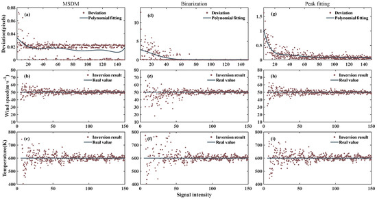 We add Poisson noise to the interferogram because the observation is also limited by photon noise. The intensity of Poisson noise is related to the gray value of the image. Figure 7 shows the interferogram center, wind, and temperature derived using the three algorithms. All three algorithms work well at higher signal intensity. The binarization remains the worst at low SNR and the MSDM has a slight advantage over the peak fitting.