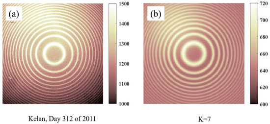 (a) Distorted FPI airglow interferogram (Kelan, Day 312 of 2011) and (b) simulated distortion interferogram (K = 0.1).
