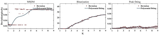 Figure 9 shows the interference ring center determined by the three algorithms. The center determined by the binarization is completely wrong. A suitable threshold cannot be found to divide the images. The deviations of the MSDM and peak fitting are less than 0.08 and 0.02, respectively.