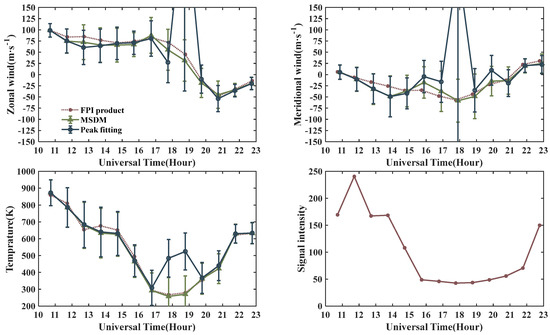 The FPI in Kelan is manufactured by the National Center for Atmospheric Research (NCAR). The Kelan FPI mainly includes a control system, dome, sky scanner, filter wheel, standard gear, lens, and camera. The National Center for Atmospheric Research used to calibrate it and perform trial runs, so data inversion software is available. It has been in stable operation at Kelan for several years and is currently in a state of repair. We use the airglow interferogram obtained by this FPI to test the performance of the algorithm. Figure 10 only shows the inversion by the MSDM and peak fitting, as well as a comparison with the FPI product. The interferograms of this day are distorted, and the wind and temperature inverted by using binarization are completely wrong. For the zonal wind, the three inversions are generally consistent with very little deviation, except for a very large deviation in the peak fitting at 19 h. The peak fitting inversion of the meridional wind is greater than 150 m/s at 18 h. For temperature, the deviation in MSDM is less than 50 K, while the deviation in the peak fitting exceeds 250 K at both 18 and 19 h. The wind and temperature deviations are at their maximum at 18 h, which means that the quality of the interferogram is low. Finally, we can see that the signal intensity first decreases and then increases, and is lowest at 18 and 19 h. Signal intensity is susceptible to atmospheric and other factors, thus reducing the SNR of airglow interferograms. The wind and temperature errors prove each other with the signal intensity. It is also demonstrated that the MSDM has better stability than peak fitting at low SNR.