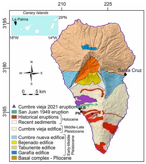 La Palma is one of the youngest islands of the Canary Islands, and it is an intraplate volcanic archipelago located close to the NW coast of the African continent. The island is located in the westernmost part of the archipelago, covering an emerged area of 708 km2 (Figure 1). The insular volcanic edifice developed from 4000 m below sea level up to 2400 m above sea level; and overlies an old oceanic lithosphere (Jurassic age, magnetic reversal isochron M25, 156 Ma) [11]. The seamount stage started ~4–3 Ma ago, resulting in the construction of a basaltic Pliocene submarine edifice comprising a gabbroic plutonic complex [12] that presently outcrops to the north of the island (Figure 1, Basal complex). Subaerial volcanism started 1.8 Ma ago and built several volcanic edifices (Garafia, Taburiente, Cumbre Nueva and Bejenado), which developed in the northern part of the island after successive stages, and building periods alternated with large flank collapses. Volcanic activity paused ~0.4 Ma ago, and after an erosion period, the activity migrated south [12,13]. This last stage (from ~125 ka to the present) corresponds to the development of the Cumbre Vieja edifice (e.g., [14,15]) (Figure 1). Subaerial volcanic activity is mainly represented by basaltic, basanitic and tephritic lava flows and pyroclastic deposits produced by successive Strombolian eruptions (e.g., [12]).