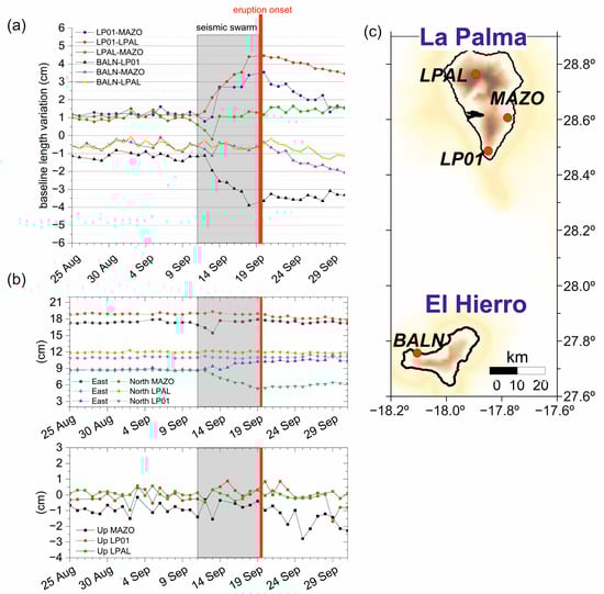 To study the surface displacements preceding the eruption onset, when a significant increase in the seismic events took place, and during the first two weeks of the eruptive process, we analyzed data from available permanent GNSS stations in La Palma (LP01, LPAL from IGN, and MAZO from the GRAFCAN-Government of Canary Islands), as well as from our BALN station located on El Hierro Island [33] (Figure 2). We used the precise point positioning (PPP) technique to process the data [34]. The results reveal increases of ~3.5 cm and 2.5 cm in the LP01-LPAL and LP01-MAZO baselines, respectively, and a decrease in the LPAL-MAZO baseline of ~1 cm. Additionally, the analysis suggests a remarkable decrease of ~3 cm in the BALN-LP01 baseline (Figure 2). In addition, the computed horizontal displacements are in the range of 2 to 4 cm for stations LP01 and MAZO, whereas the maximum ground uplift detected at LP01 was ~1.5 cm.