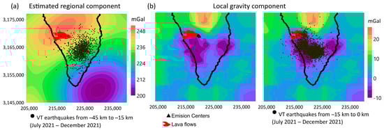 (a) Regional component of the gravity field estimated by covariance analysis. The horizontal distribution of deep volcanotectonic (VT) earthquakes is included. (b) Corresponding local gravity map calculated by removing the regional component from the observed gravity map without (center)/with (right) the horizontal distribution of shallow volcanotectonic events. UTM coordinates are in m, in zone 28.