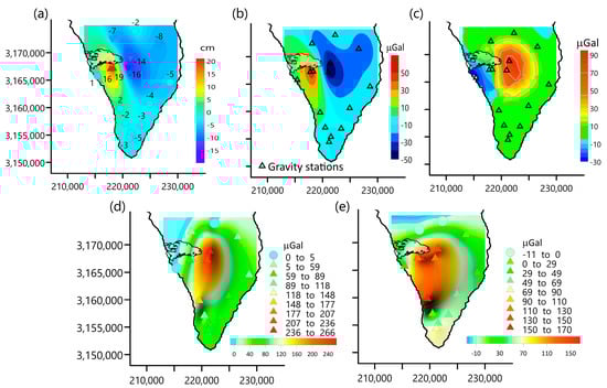 (a) Height differences observed between January 2022 and July 2021 as calculated through GNSS data processing observed in the gravity network. (b) Free-air correction for the gravity stations obtained from the height data (a). (c) Gravity attraction due to lava flows and the new volcanic edifices of the 2021 eruption. (d) Values of gravity differences calculated between January 2022 and July 2021. (e) Same results as (d) but considering the free-air correction and gravitational attraction of the new topography. Note that the contour maps shown in (d,e) are influenced by the distribution of a few gravity stations, showing predicted values where there are no data. UTM coordinates are in m, in zone 28.