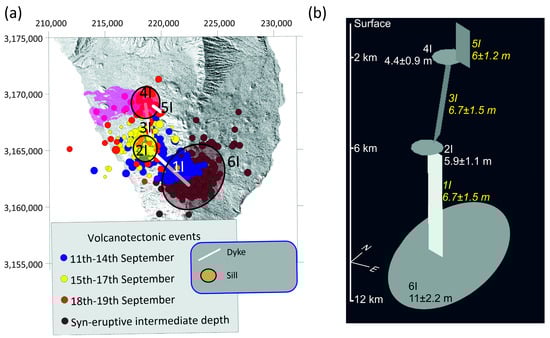 (a) Plane view of the spatiotemporal distribution of volcanotectonic earthquake events (mbLg > 2) from 11–19 September 2021 and syneruptive intermediate-depth events. From this information, we produced an initial model of the magma plumbing system of the 2021 eruption consisting of different dikes (1I, 3I and 5I) and sills (2I, 4I and 6I). (b) Three-dimensional sketch of the model shown in (a). The values next to the labels correspond to the thickness of the sills and the width of the dikes. Details on the geometric properties of the elements of the model can be found in the text and in Table 1. UTM coordinates are in m, in zone 28.