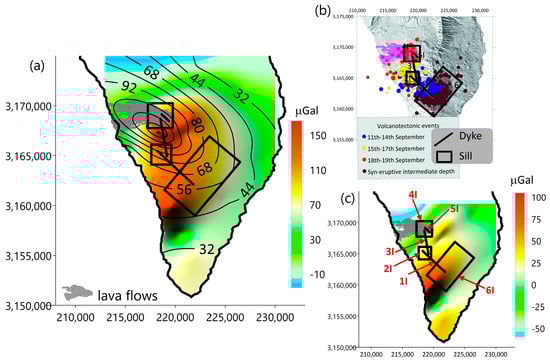 (a) Map of the gravity response due to the initial model of the magmatic feeding system (black contour lines) (Table 2), which should fit the gravity differences observed between January 2022 and July 2021 (filled colored contour map). (b) The sills and dikes were approximated by prisms (black lines and red labels in (c)) according to the locations of the volcanotectonic earthquakes. (c) Map showing the differences between the observed and calculated gravity values obtained by the interpolation of the data measured at the gravity stations. The maximum value (dark red spotted area) shows a gravity increase between surveys not justified by the gravity attraction of the sills and dikes of this initial model. UTM coordinates are in m, in zone 28.