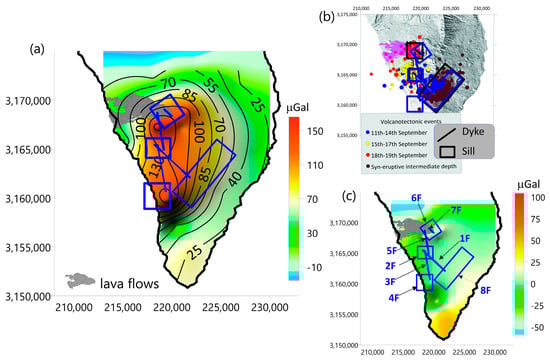 Table 3 lists the final parameters of the model that best fit the observed temporal gravity increase detected by the gravity network. The final elements of the model are renumbered (followed by suffix F) in chronological order of emplacement to distinguish them from the initial model elements (followed by suffix I). Figure 10 and Figure 11 show the elements of the new model, i.e., the calculated and the residual gravity fields, which were obtained by subtracting the calculated gravity from the observed data. The gravity residuals show the best fit for the observed data with a standard deviation of 29 μGal (Figure 10c and Figure 11), which improves the gravity fit of the initial model gravity. It should be noted that we propose a model to justify the gravity increase observed after the volcanic process. This means that elements accounting for a gravity decrease or explaining very local (spatial or temporal) effects are not included in the model. For this reason, some gravity stations outside the modeled area display high negative residual values.