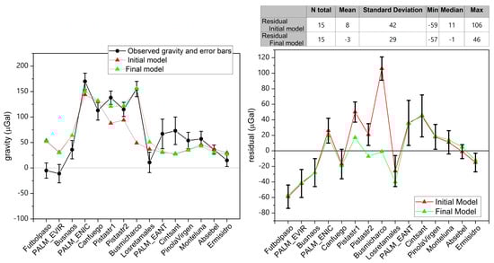 Comparison between gravity values (left) and residuals (observed gravity minus calculated gravity) (right) corresponding to the initial and final models. The observed gravity differences between January 2022 and July 2021 are displayed in black (left). Error bars indicate the errors estimated from the observed gravity values and free-air correction for each station. The statistical parameters are included in the table (right). The distribution of the gravity stations is indicated in Figure 3.