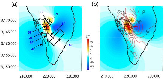 - Okada, Y. Internal deformation due to shear and tensile faults in a half-space. Bull. Seismol. Soc. Am. 1992, 82, 1018–1040. [Google Scholar] [CrossRef]