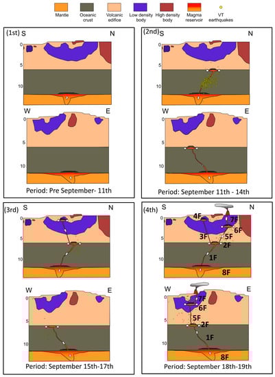 4—After reaching a depth of ~2 km, seismicity expanded horizontally, first to the north and then east–west over an area of ~2 km in diameter that was very close to the place where, just a few hours later, the eruption started (19 September). We interpret the latter seismic activity as the emplacement of a sill-like shallow local magma reservoir (4I in Figure 8).