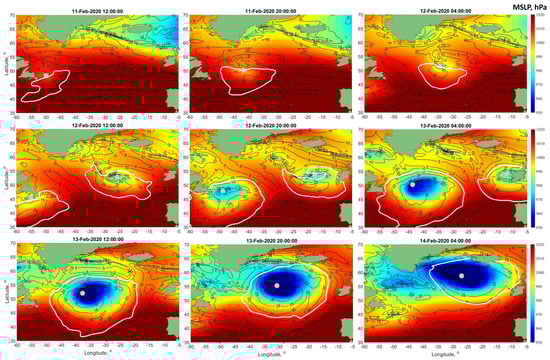 Based on the NCEP/CFSv2 hourly wind fields and surface pressure maps, two ETCs were identified moving simultaneously over the North Atlantic between 11 February 2020 and 15 February 2020, as seen in Figure 1. The first ETC (ETC#1) appeared on the morning of 11 February 2020, in the west of the basin at 48 degrees north latitude, and then moved east until it reached the coast of Ireland on the morning of 13 February 2020. The second ETC (ETC#2) also appeared in the west of the basin at 46°N, but a little later, at noon on 12 February 2020. Unlike the ETC#1, its movement was directed to the northeast, and when it reached 60 degrees north latitude at noon on 14 February 2020, ETC#2 lost shape and turned into an “air stream” along the southeast coast of Greenland and, eventually, continued to exist as the Icelandic low, as seen in Figure 1.