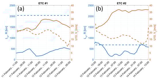 Time evolution of ETC#1 (a) and ETC#2 (b) parameters: (red thick line) maximum wind speed, ; (red dashed line) translation velocity, ; (blue thick line) radius of maximum wind speed, ; (blue dashed line) critical fetch, from (1).