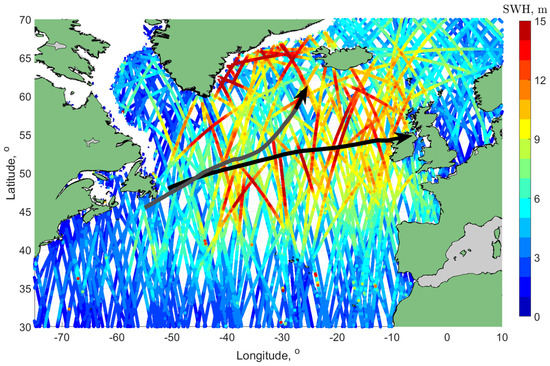 The measurements of significant wave height (SWH) are produced by different satellites, as shown in Figure 3. The SWH data used in this study include level two altimeter 1 Hz observations of Sentinel-3A, Sentinel-3B, Jason-3, CryoSat-2, AltiKa, and nadir nsec products of CFOSAT-SWIM, illustrated in Figure 3, with trajectories of ETCs. To show the SWH values, the land/ice mask and data quality flags are applied. Referring to Figure 3, one may find that the highest waves with SWH m are observed around the ETCs tracks crossing the northern Atlantic Ocean. To analyze the SWH of waves generated by ETCs in more detail, the altimeter tracks which cross the storm areas of each of ETCs were selected and presented in Section 3.1.1.