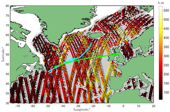 Measured (colored boxes) and after eliminating 180° ambiguity (black arrows) in “wave boxes” on two sides of the CFOSAT-SWIM track in Northern Atlantic during the period of 11 February 2020 00:00 UTC —16 February 2020 00:00 UTC, after applying ice and land masks. The green and cyan colored lines and arrows show the trajectory and direction of the ETC#1 and ETC#2, respectively.