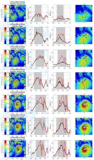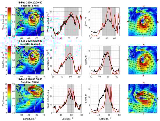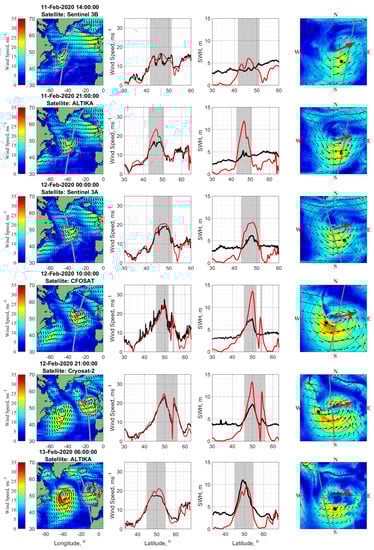 Among 130 altimeter tracks crossing the North Atlantic in the period 11–15 February 2020, 14 and 26 tracks crossed storms ETC#1 and ETC#2, respectively. Some of these tracks are displayed in Figure 5 for ETC#1 and Figure 6 for ETC#2, together with corresponding profiles of altimeter-derived wind speed and SWH (black lines), and cross-section profiles of the NCEP/CFSv2 wind speed and the SWH of fully developed seas, [] along the selected altimeter tracks. Vertical shaded areas in columns 2 and 3 indicate the parts of the tracks crossing the ETCs’ storm area exactly, shown on the wind fields in the left column by a red contour.