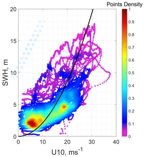 Two−dimensional scatter plot of significant wave height SWH as a function of wind speed, colored with points density. The black curve shows the [].