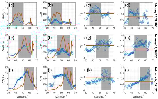 Along−track profile of (a,e,i) SWHs, ; (b,f,j) spectral peak wavelength, ; (c,g,k) inverse wave age,; and (d,h,l) wave steepens, with . Blue circles and curves show the measurements, and the orange curves represent the values associated with fully developed waves. The average time of the SWIM passage over the North Atlantic Ocean is shown on the right side of each row. The SWIM nadir tracks can be found in 2nd, 8th and 10th rows of Figure 6.