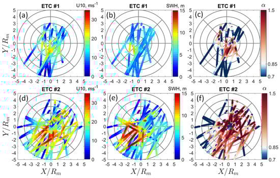 Spatial distributions of SWH, shown in Figure 9b,e, exhibit higher values in the rear-right quadrant at a radial distance about . In our case, the largest surface waves approximately coincide with the area of higher wind speeds. On the one hand, relative SWH enhancements in the same quadrant were reported by [,] using numerical simulations. This is consistent with predictions of the self-similarity theory of wave development in moving storms based on the extended fetch concept [,,]. This mechanism suggests that in the right sector, where wind direction coincides with ETC heading, developing waves stay under wind forcing for longer. Wave energy can then accumulate compared to other sectors or become a stationary storm with the same and .