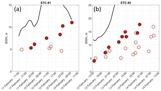 Time evolution of maximum SWH values for ETC#1 (a) ETC#2 (b). The filled red circles are related to the SWH of wind waves (), and the open red circles—to the SWH of swell. The black curves show the SWH of fully developed waves calculated for local .