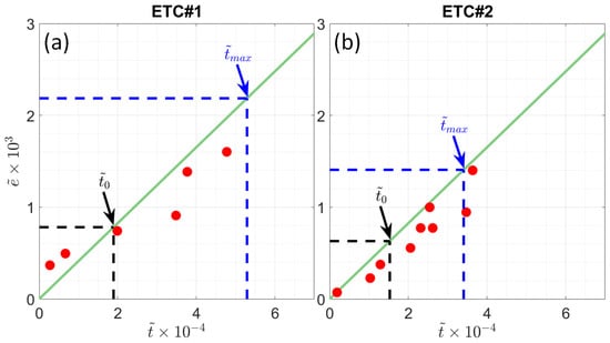 Dimensionless energy, , versus dimensionless time, , for ETC#1 (a) and ETC#2 (b): red circles are observations, and green lines are duration laws (6). Dashed-black and dashed-blue lines indicate the dimensionless time interval and defined by (7) and (8), and corresponding dimensionless energy predicted by duration laws (6).